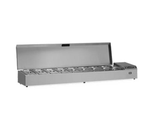 Thermowell Refrigerated Preparation Well, 1862mm W, holds (9) 1/3 GN pans (not included), +4/+8° C temperature range, hinged lid designed to stay open for easy access, digital thermometer, adjustable thermostat, food safe stainless steel interior & exterior, rubber feet, space saving wall mount option available, 1/3 hp, Out of Scope, R600a