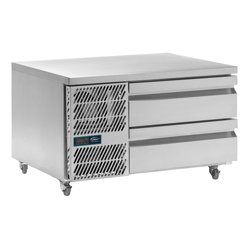 UBC Refrigerated Griddle Stand, two-drawer, 160 litre (5.7 cu. ft.) capacity, side mount self-contained refrigeration (removable), 1000mm W, +1/+4° C temperature range, automatic defrost, (2) drawers, accommodates (1) 2/1 GN pans (not included), accommodates (1) 600mm chargrill/griddle (not included), CoolSmart controller, up to a 43° C ambient, polyurethane insulation, steel interior & exterior, HD non-marking swivel and brake castors, 2.25kW/24 hrs, 230v/50/1-ph, 8.7 amps, MEPS C, CE, R290
