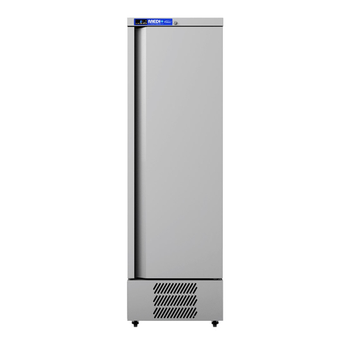 Medi+ Cabinet Pharmaceutical Refrigerator, one-section, 595mm W, front vented self-contained refrigeration, 335 litre capacity, +2/+8° C temperature range, (1) solid door with magnetic balloon gaskets, barrel locks, (4) shelves, Medi+ controller with digital display, audio and visual alarms, lockable keypad, 80mm polyurethane insulation, exceeding Climate Class 5, stainless steel exterior, aluminium interior, 230v/50/1-ph, 9.57 startup amps/1.7 running amps, R290