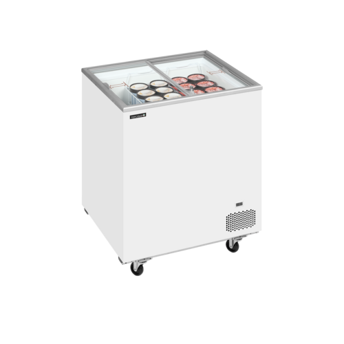 Sliding Flat Glass Lid Chest Freezer, Flat sliding glass lids with lock, Includes full set of baskets, Great branding possibilities, Digital thermometer, Castors with brake, Climate class 5 for high performance in warm surroundings, white exterior finish, Interior Finish: White painted steel, Net Weight: 46kg”, Defrost Type: Manual, R600a refrigerant, Climate Class: 5Energy Rating: D,Energy Consumption: 534kWh per Annum, 13 amps