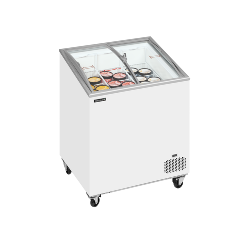 Sliding Curved Glass Lid Chest Freezer, Sloping display for excellent presentation, Curved sliding lids with lock, Ideal for branding, Digital thermometer, Castors with brake, Climate class 5 for high performance in warm surroundings, white exterior finish, Interior Finish: White painted steel, Net Weight: 53kg”, Defrost Type: Manual, R600a refrigerant, Climate Class: 5Energy Rating: D,Energy Consumption: 552kWh per Annum, 13 amps