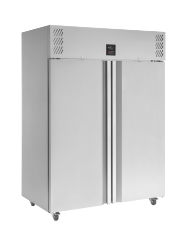Crystal Freezer Bakery Cabinet, reach-in, two-section, top mount self-contained refrigteration (removable), 1400mm W, -13/-21° C temperature range, (2) solid self-closing doors, barrel locks, (40) 18″ x 30″ tray capacity (not included), CoolSmart controller, 75mm polyurethane insulation, aluminium interior, food safe stainless steel exterior, HD swivel castors with brakes, R290, Out of Scope