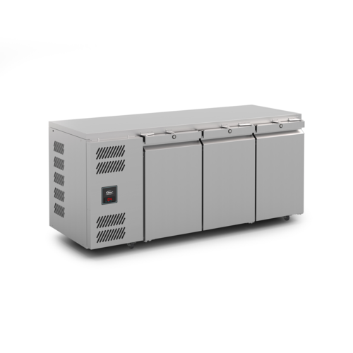 Jade Biscuit Top Counter Freezer, reach-in, three-section, side mount self-contained refrigeration (removable cassette), 1800mm W, 469 litre capacity, -18/-22° C temperature range, (3) self-closing doors with magnetic balloon gasket, barrel locks, (2) 1/1 GN shelves per section, Capacitive Touch CoolSmart controller with IP55 rated display, polyurethane insulation, designed to operate efficiently up to a 43° C ambient, stainless steel exterior, aluminium interior, HD non-marking swivel castors with brakes, R290 MEPS C