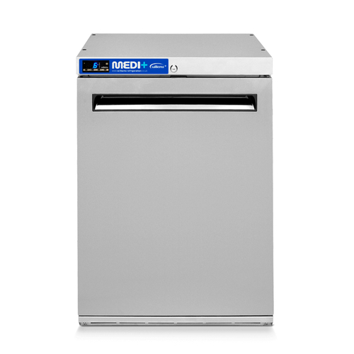 Medi+ Cabinet Pharmaceutical Freezer, undercounter, one-section, 606mm W, front vented self-contained refrigeration, 135 litre (4.8 cu. ft.) capacity, -18/-22° C temperature range, (1) glass door with magnetic balloon gaskets, barrel locks, (2) shelves, Medi+ controller with digital display, audio and visual alarms, lockable keypad, 80mm polyurethane insulation, exceeding Climate Class 4, stainless steel exterior, aluminium interior, 230v/50/1-ph, 7.7 startup amps/1.3 running amps, R290