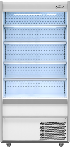 M-Series Multi-Deck Refrigerated Display Case, self-service, open front, night blind, bottom mount self-contained refrigeration, 960mm W, 458 litre (16.2 cu. ft.) capacity, +3/+5°C temperature range, digital controls, (4) adjustable shelves with detachable ticket strips, LED strip lighting, white finish, castors