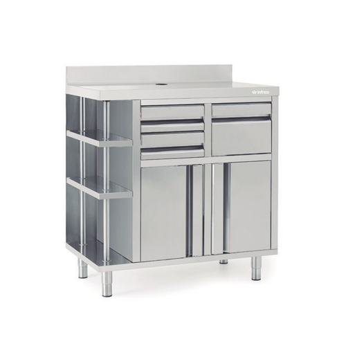 Infrico Back Bar Coffee Unit, High grade 304 stainless steel fabrication, Adjustable legs, 100mm coved upstand, Suites FMPP range, Pull down knock out drawer, Stylish, sturdy & practical, Sturdy unit to sit espresso machines, Side shelves for cups & saucers
