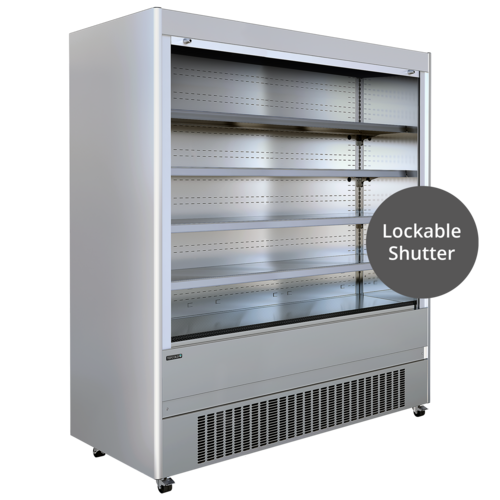 Multideck with shutter, Ideal for impulse buys and promotions, Lockable security shutter, Ventilated cooling, adjustable shelves, fully automatic, Castors with brake, LED interior light with switch, Digital controller and temperature display, Ticket strip included, Exterior Finish: SS304, Interior Finish: SS304, Net Weight: 320kg”, automatic defrost type, R290 Refrigerant, Climate Class: 3Energy Rating: E,Energy Consumption: 7455kWh per Annum, 13 amps