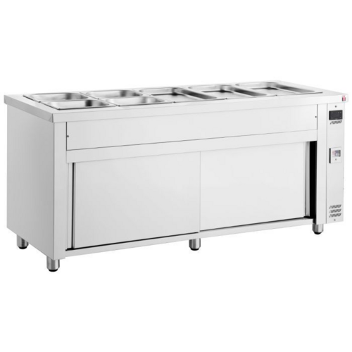 Inomak Gastronorm Bain Marie, High grade AISI 304 stainless steel exterior & interior, Open type, Wet well accepts GN1/1 upto 150mm deep (not supplied), Digital controller with temperature display, Wet well bain marie with easy access drain tap, Heater protection against low water level in the tank, Robust construction, Height adjustable stainless-steel legs, Tempered Glass Vitrines