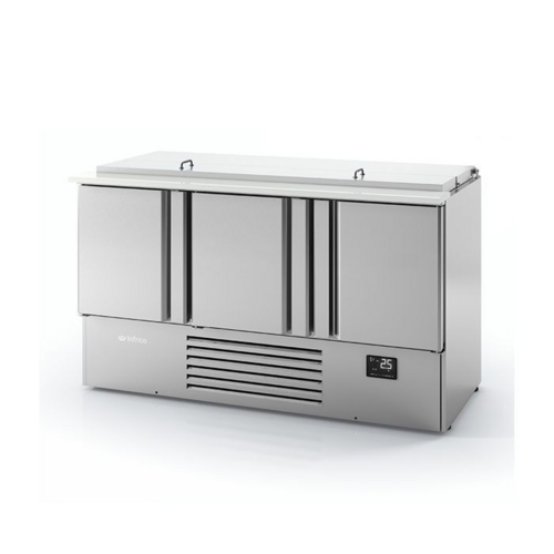 Infrico Compact Gastronorm Counter with cutting board, 355L capacity, High grade AISI 304 stainless steel exterior & interior, Rounded internal corners for easy cleaning, 1 x GN1/1 shelf plus 3 pairs tray slides per door, Polypropylene cutting board, Accepts GN13 containers, Gastronorm containers not supplied, Glass door available, Replaceable door gasket, Hinged stainless steel lid to cover gastronorm well, Automatic defrost, Ventilated cooling, Electronically controlled, Digital temperature display