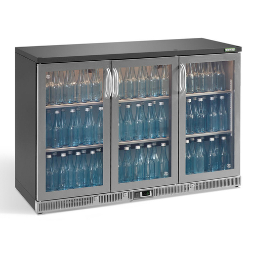 Noverta Bottle Cooler, undercounter, three-section, 1350mm W, 315 litre capacity, (333) 330 ml bottle capacity, (3) hinged glass doors with locks, digital thermostat, +1° C / +18° C temperature range, automatic defrost, silver coloured skin plate interior, LED lighting, (6) adjustable shelves, stainless steel exterior, 220-240v/50/1-ph, 240 watts, ETL, ECA Approved, MEPS C