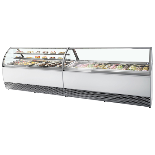 Ventilated Scoop Ice Cream Display, 1661mm W, holds (18) Napoli pan(not supplied), dual zone temperature control, -20° to -14°C adjustable temperature range, temperature displays, reat curtain, hot gas cooling,hydraulic lift up curved glass, heated front and side glass, double glazed side glass, ventilated (fan assisted) cooling, white exterior, stainless steel interior, fitted castors, R290, 16 amp