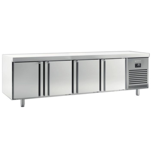 Infrico Refrigerator Counter, High grade AISI 304 stainless steel exterior & interior, Rounded internal corners and internal drain for easy cleaning, Supplied with one shelf per door (600mm x 400mm), Adjustable legs, Glass door option with LED lighting available POA, Automatic defrost, Ventilated cooling, Fully automatic operation, Electronically controlled, Digital temperature display, Completely injected compact structure, Door gaskets are replaceable