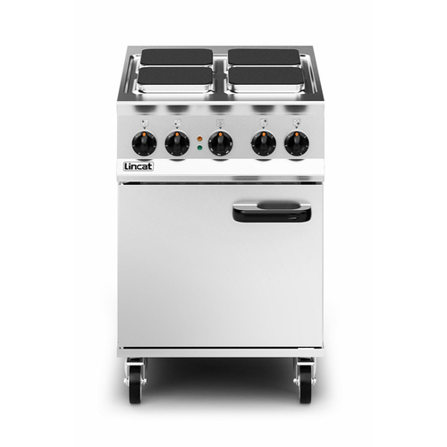 Opus 800 Oven Range, electric, 600 mm, (4) square 2.6 kW hotplates, fan assisted oven with thermostatic control, solid door, (3) chrome plated shelves, removable bottom & side oven liners, stainless steel construction, IPX4, CE