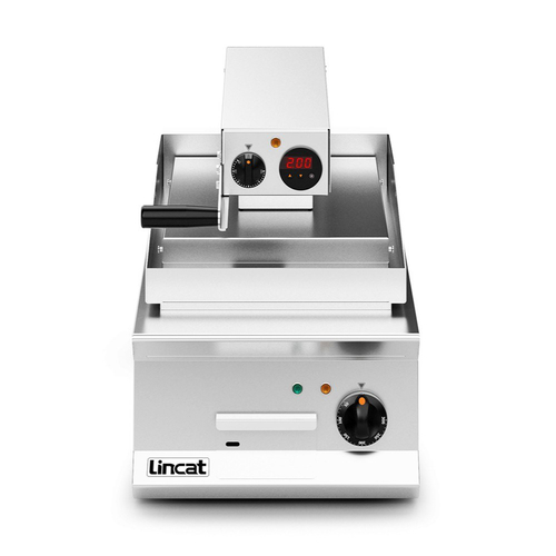 Opus 800 Clam Griddle, electric, countertop, 400 mm wide, (1) ribbed plate & smooth griddle base, independent thermostatic control, digital timer on clam top, 2 litre fat collection drawer, includes: PTFE non-stick sheets & scraper, stainless steel construction, IPX4, CE