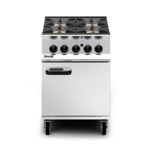Opus 800 Range, natural gas, 600 mm, (4) 7.5 kW open burners, flame failure protection, thermostatic controls, standard gas oven, solid insulated door on right-hand hinge, side & back panels, (2) chrome plated shelves, flush mount rear flue, removable bottom oven liner, stainless steel construction, 125,561 BTU, CE
