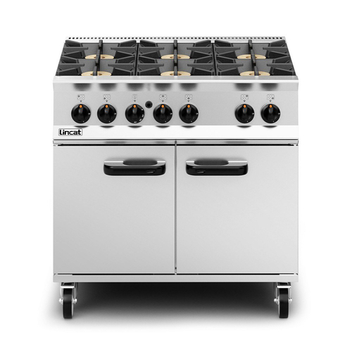 Opus 800 Range, propane gas, 900 mm, (6) 7.0 kW open burners, flame failure protection, thermostatic controls, standard gas oven, (2) solid insulated doors, (2) chrome plated shelves, flush mount rear flue, removable bottom oven liner, stainless steel construction, 167,870 BTU, CE