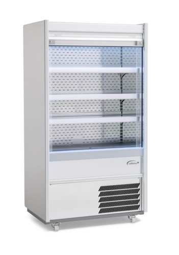 R-Series Multi-Deck Refrigerated Display Case, self-service, open front, 960mm W, 279 litre (10 cu. ft.) capacity, bottom mount self-contained refrigeration, +3/+5°C temperature range, (3) removable shelves with detachable ticket strips, LED strip lighting, thermostat control, security shutter with lock, stainless steel finish, castors