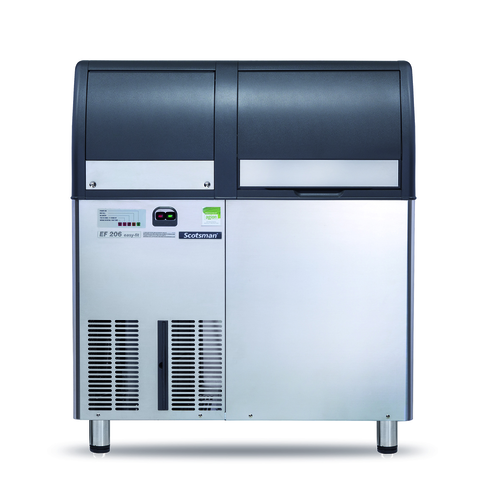 Scotsman EF207 EcoX Flake Ice Maker With Bin, flake-ice 25% residual water, air-cooled, 200-kg/24 hours production, 60-kg storage bin capacity, built-in drain pump, self-contained refrigeration, stainless steel exterior, electromechanical controls, includes integrated XSafe natural sanitation system, 230v/50/1-ph