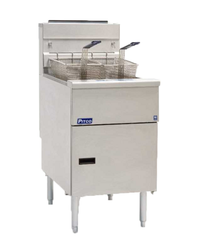 Pitco Solstice Fryer, gas, floor model, 30-39 litres capacity, millivolt thermostat controls, cabinet base, includes: (2) baskets, clean-out rod, removable basket hanger & fryer cleaner sample, mild steel tank, stainless steel front, sides & door, 140,000 BTU