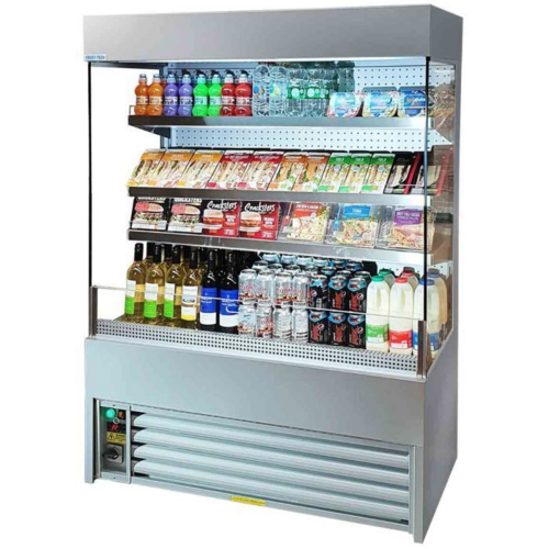 Frost-Tech Low Height Tiered Display, Full length top mounted light, Under shelf LED lighting, Digital temperature control display, Full glass end panels, 3 tier adjustable shelving plus base, Adjustable feet, Integral night blind, clear acrylic shelf edge risers, Auto defrost, 304 Mirrored stainless steel, Low front to maximise display space, Low energy compressors, High performance long life fan motor, Slide out condensing system, Stainless steel drip tray, Self evaporating drainage system, CFC-Free insulation