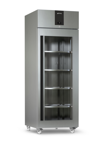 Smeg Professional Upright Chiller, single glass door, 700L capacity, temperature range -2°C to 8°C, RHH & rack holders, reversible door, AISI 304 stainless steel, LCD display, internal strip LED with low energy consumption, (3) racks included, 230v/50, 13 amp, C-Rated
