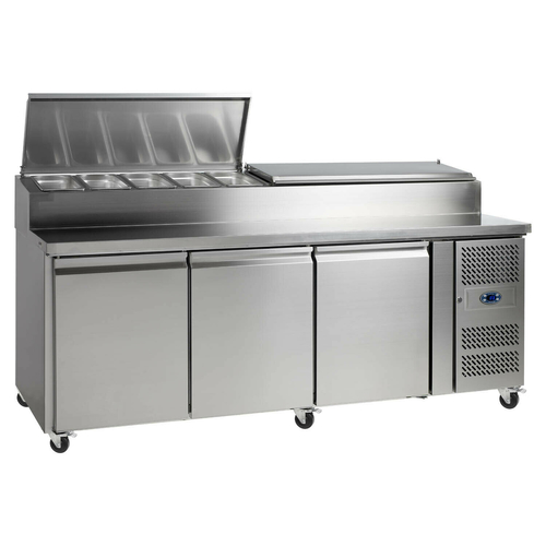 Tefcold® Refrigerated Counter, 1795mm W, 429 litre/15.1 cu. ft. capacity, accepts (9) 1/3 GN pans, (3) self-closing doors & (3) adjustable shelves, fitted splashback, +2° to +10°C adjustable temperature range, digital display/controller, fan assisted cooling, off-cycle defrost, side mounted self contained refrigeration, stainless steel exterior & interior, lockable castors, R290, 300 watts