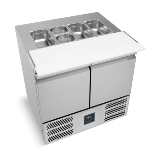 Refrigerated Salad Prep Counter, front vented, two-section, 252 litres capacity, wells accommodate 1/3GN or 1/6 GN Pans, +1/+4° C storage and +4/+8° C well temperature, extendable worktop/cutting board for increased prep space, 4 x shelves, self-closing solid doors with balloon gaskets, integral easy grab door handle, food safe stainless steel exterior and interior, castors (rear), adjustable feet (front), Out of Scope