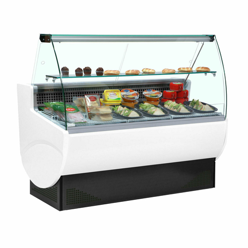 Trimco Slimline Serve-Over Counter Display Case, curved front glass, 980mm W, rear mounted self-contained refrigeration, +2°C to +8°C temperature range, (1) ambient shelf, rear sliding acrylic doors, digital controller & temperature display, interior light with switch, static cooling, off cycle defrost, refrigerated understorage with hinged door, includes 13 amp socket on rear, stainless steel interior, white exterior, R290, 250 watts (Web Deal Price is available until the 31st January 2026 whilst stocks last, when you place your order directly through the TEFCOLD website only)