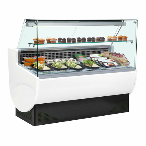 Trimco Slimline Serve-Over Counter Display Case, flat front glass, 1280mm W, rear mounted self-contained refrigeration, +2°C to +8°C temperature range, (1) ambient shelf, rear sliding acrylic doors, digital controller & temperature display, interior light with switch, static cooling, off cycle defrost, refrigerated understorage with hinged door, includes 13 amp socket on rear, stainless steel interior, white exterior, R290, 275 watts (Web Deal Price is available until the 31st January 2026 whilst stocks last, when you place your order directly through the TEFCOLD website only)