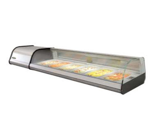 Infrico Tapas Cooler Display Unit, Anodized aluminium silver colour exterior, AISI 304 grade stainless steel interior, Supplied with GN1/3 containers (40mm deep), LED illumination in top profile, Sliding rear doors, Lifing curved front glass, Inner joints with curve edges for easy cleaning, Ventilated condensation system, Cold plate evaporation system
